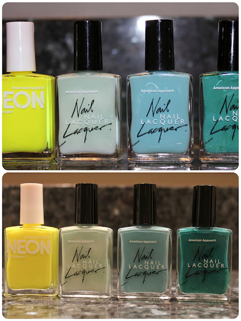 I was at my local American Apparel store and found these nail lacquers. I couldn't resist. I had to pick up these colors. The first photo is with a flash and the second is without.